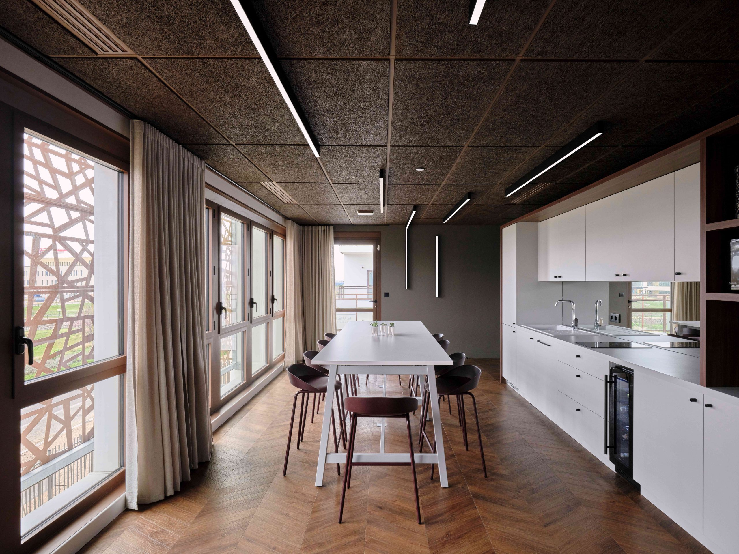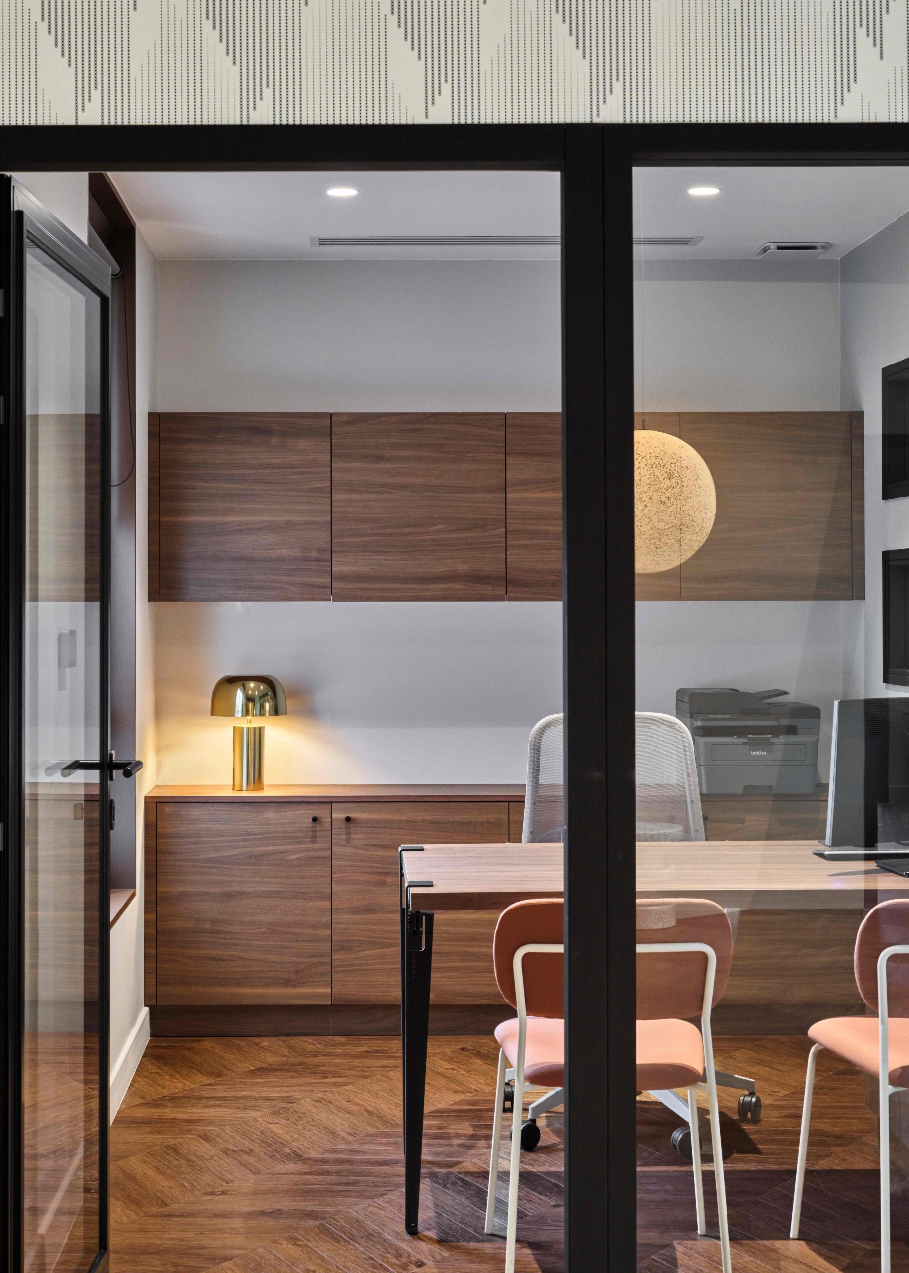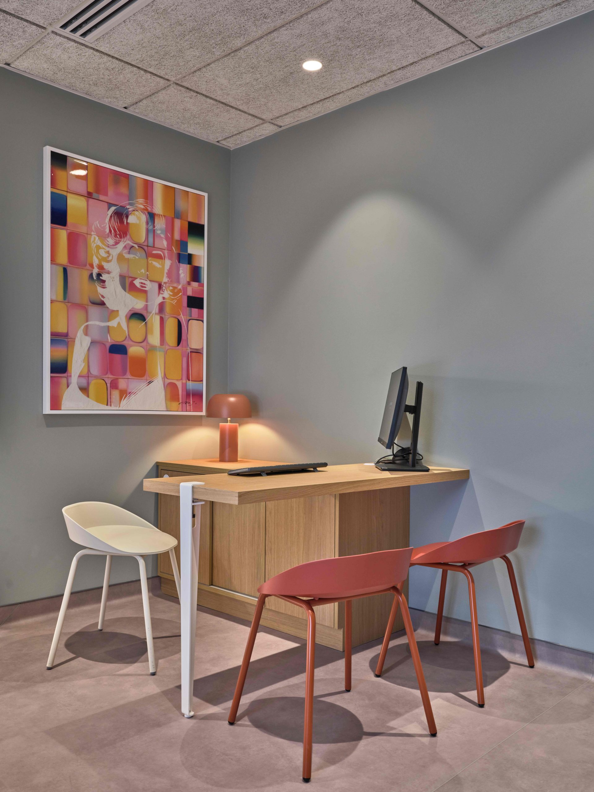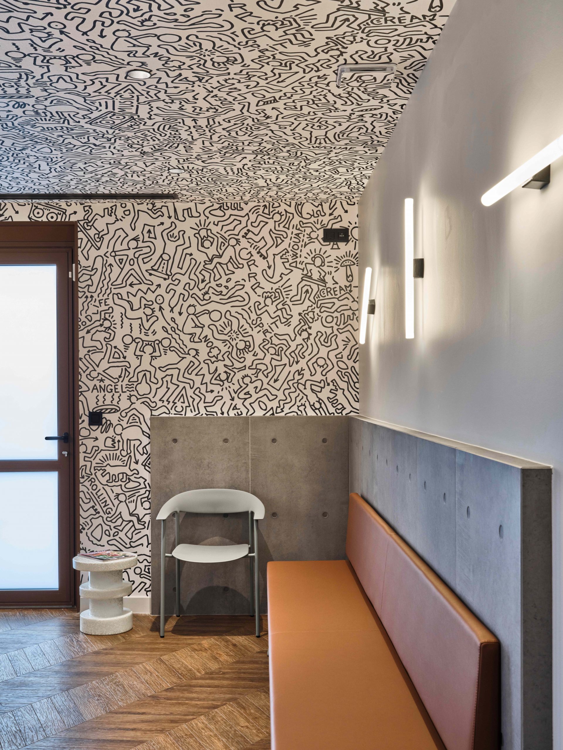 Un parti pris assez fort a été choisi pour ce cabinet à l’identité marquée. La multiplicité des éléments graphiques, volumes et le choix des matériaux a été travaillé en synergie pour un rendu contemporain et « rock’n’roll ».