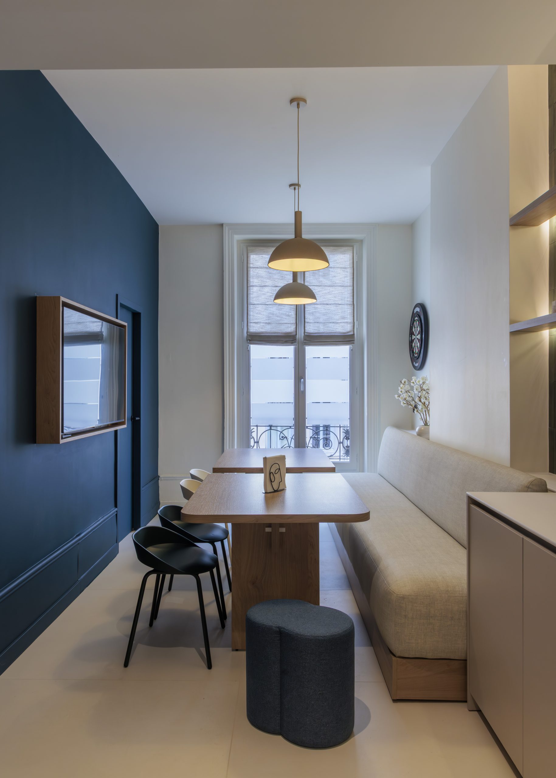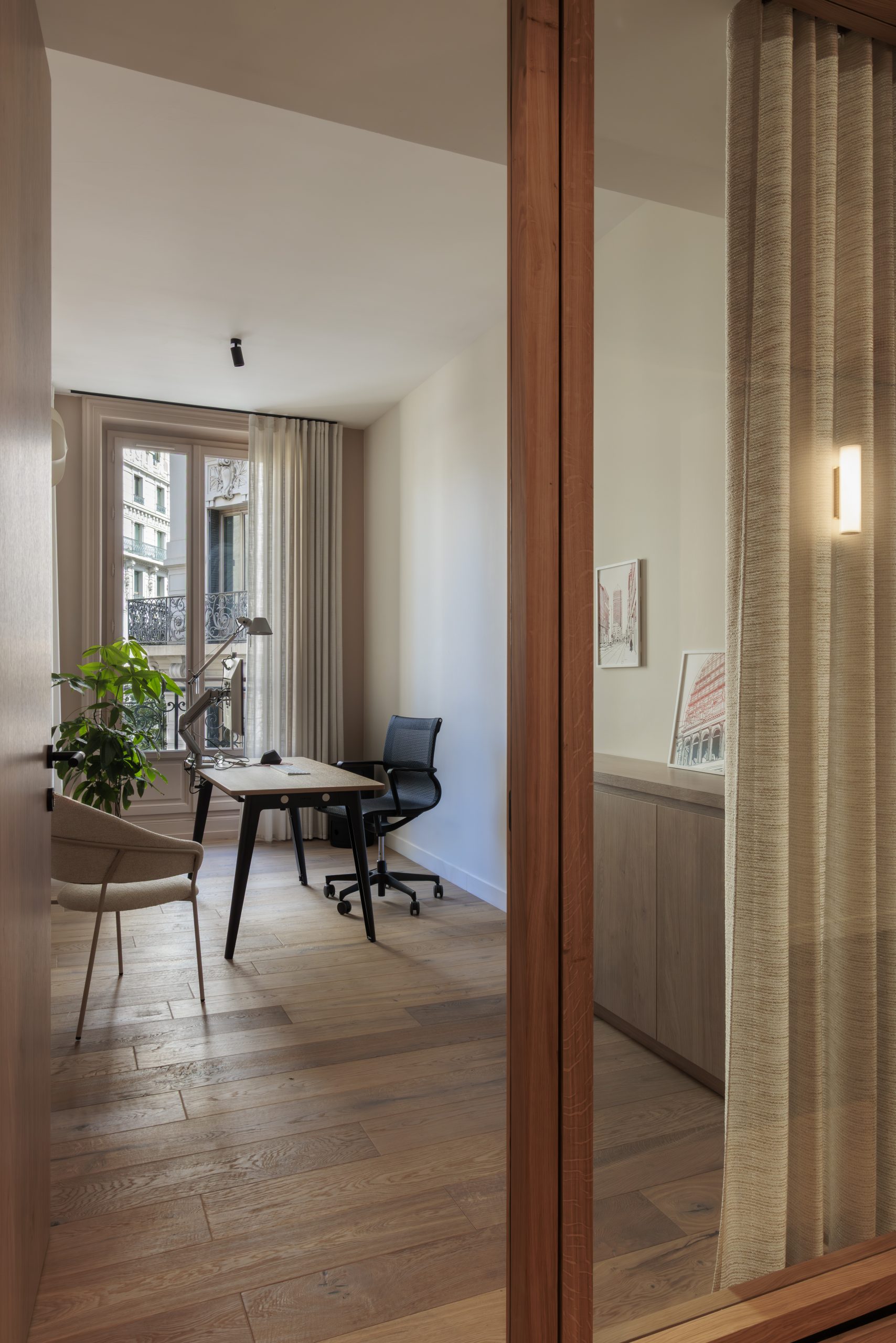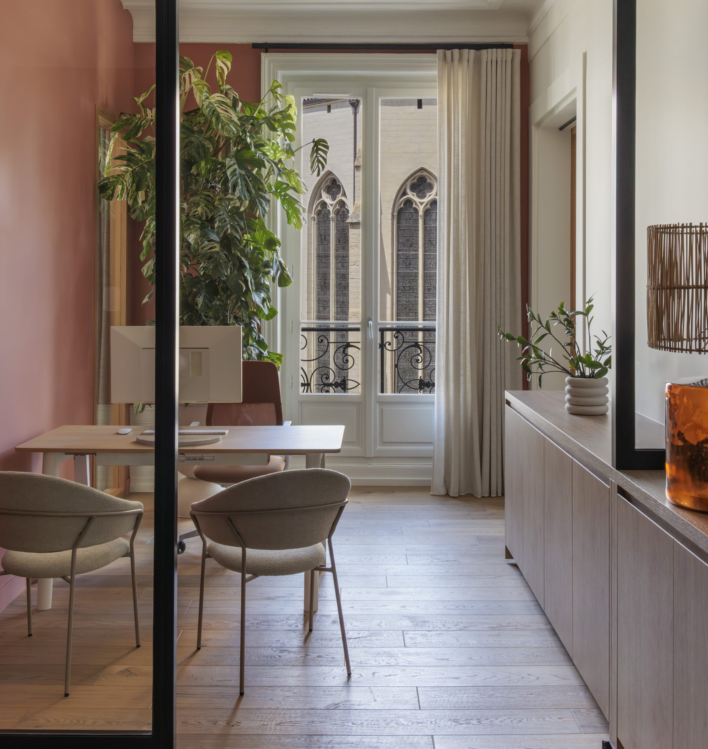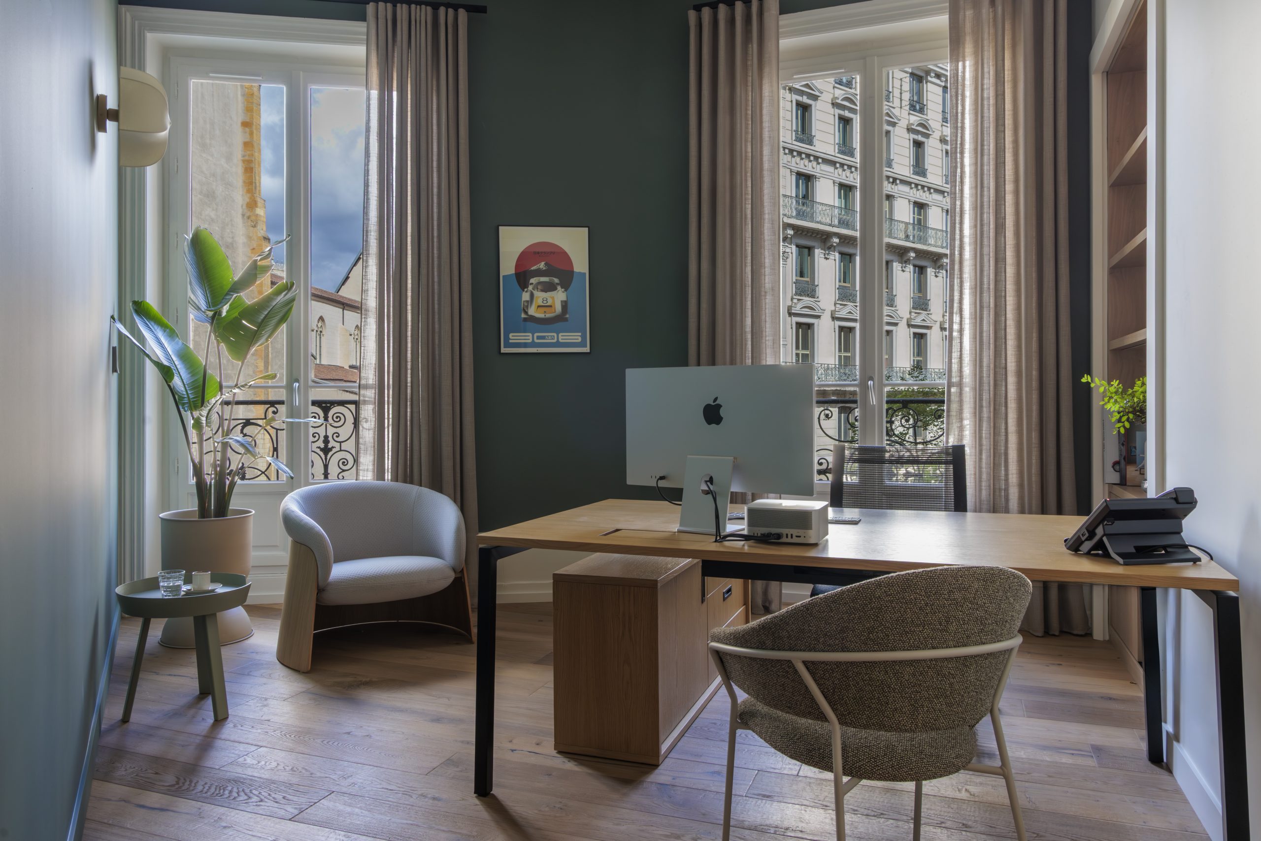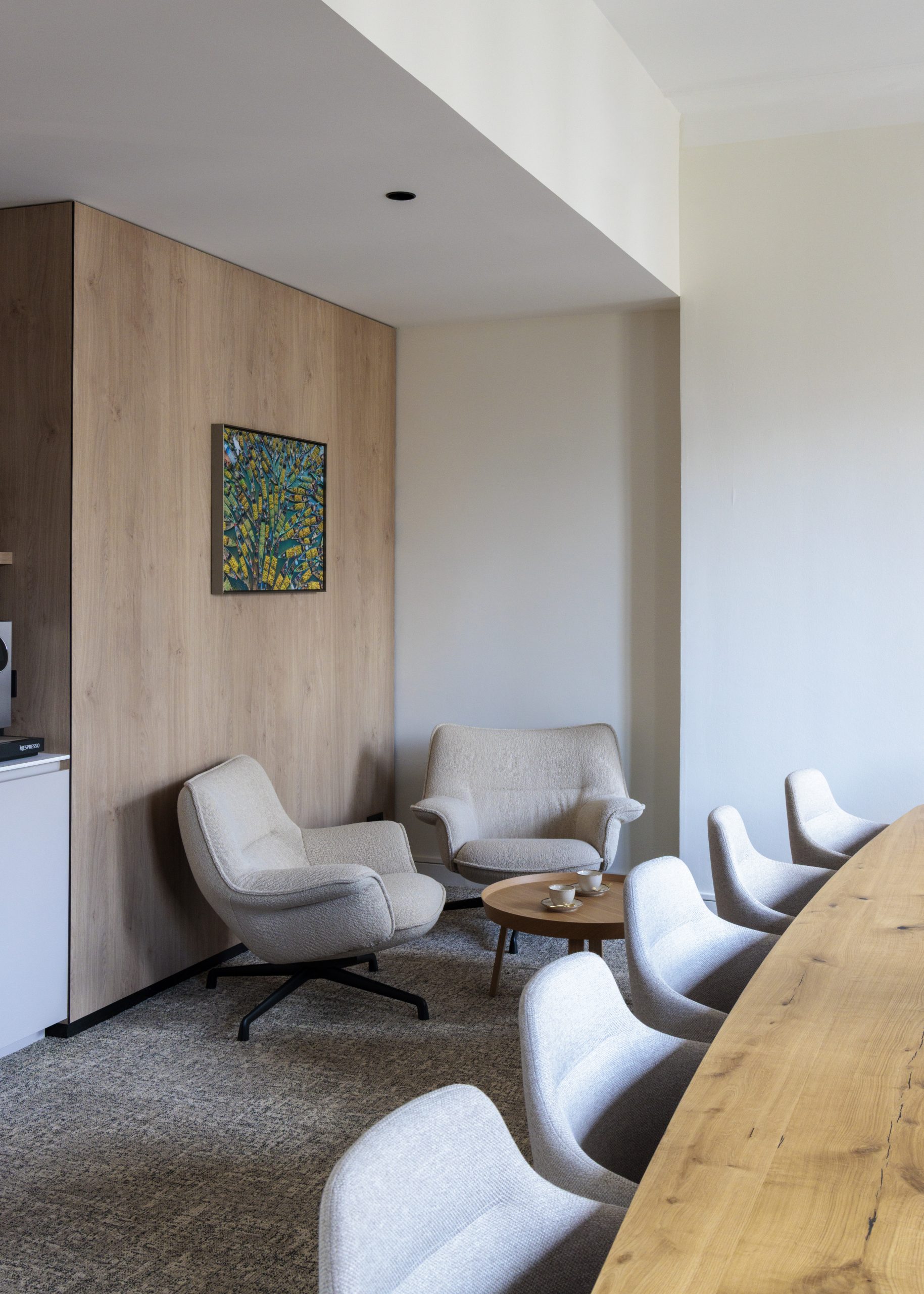 Le parti pris choisi est assez fort pour ces bureaux à l’identité marquée. La coloration, les nombreux tissus et le mobilier décoratif joue un rôle important dans ce bureau à l’allure d’habitat. Les volumes et le choix des matériaux ont été travaillé en synergie pour un rendu contemporain et « chaleureux ».